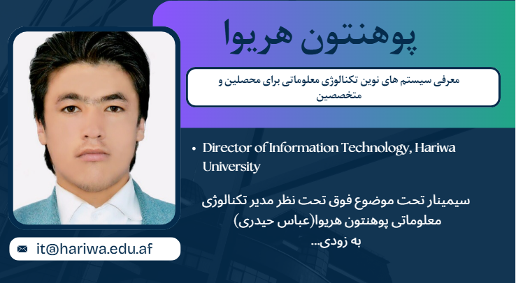 پوهنتون هریوا در نظر دارد سیمیناری تحت عنوان «معرفی سیستم‌های نوین تکنالوژی معلوماتی» برای محصلین و متخصصین برگزار نماید. در این سیمینار، جدیدترین دستاوردها، روندها و سیستم‌های مدرن در حوزه تکنالوژی معلوماتی مورد بررسی و معرفی قرار خواهد گرفت.